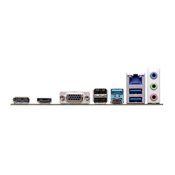 | Rear Panel I/O | – 2 x Antenna Mounting Points – 1 x PS/2 Mouse/Keyboard Port – 1 x D-Sub Port – 1 x HDMI Port – 1 x DisplayPort 1.4 – 1 x USB 3.2 Gen1 Type-C Port – 3 x USB 3.2 Gen1 Type-A Ports – 2 x USB 2.0 Ports – 1 x RJ-45 LAN Port – HD Audio Jacks: Line in / Front Speaker / Microphone |
