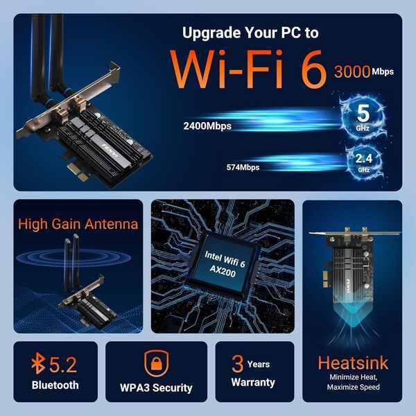 - Next-Gen Wi-Fi 6 Technology: Powered by the Intel AX200 chipset, supporting Wi-Fi 6 (802.11ax) with ultra-fast speeds up to 2.4Gbps.