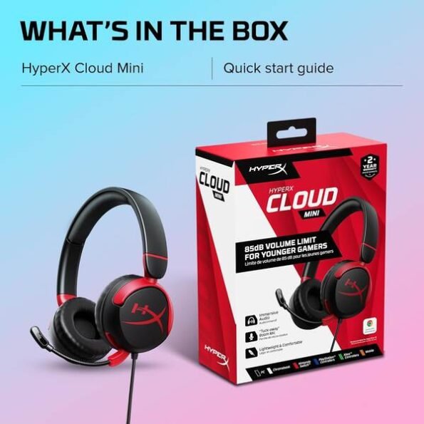 The HyperX Cloud Mini is a comfortable wired headset built for aspiring star gamers. Recommended for ages 8-12, it’s lightweight and appropriately sized for younger gamers, and more importantly, it’s designed to keep audio levels below 85dB[1]. It features a clear, flip-to-mute mic so younger gamers can chat with their friends online, and it can be tucked away when not in use[3]. The earcups can be rotated when it’s time to take a break, and they’re also great for easy transport or storage. Cloud Mini can easily connect to any device that has a 3.5mm connection, so whether your young gamer is playing on mobile, Chromebook, Nintendo Switch, PlayStation, PC, Steam Deck, or elsewhere, this versatile headset will be ready for it[2].
